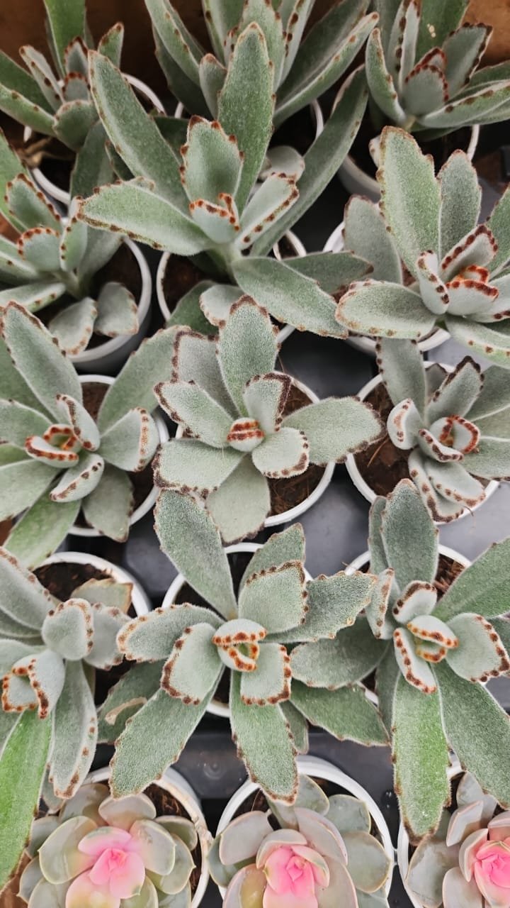 This succulent features soft, fuzzy grey-green leaves with subtle brown edges, creating a unique and textured look. Highly drought-tolerant and low-maintenance, it thrives in bright light with well-drained soil. Popular for indoor decorative arrangements, it adds both charm and resilience to any space.